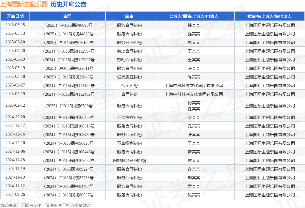 案号:(2025)沪0115民初44830号审理法院:上海市浦东新区人民法院案由:服务合同纠纷当事人信息: 原告/上诉人:施某某 被告/被上诉人:上海国际主题乐园有限公司开庭日期:2025年5月13日根据统计,近一年内以上海国际主题乐园有限公司为当事人的历史开庭公告有26则,其中案由为“服务合同纠纷”的公告以15则居首,其次为“不当得利纠纷”有2则,“劳动合同纠纷”有2则。历史开庭公告(前20条)如下:
